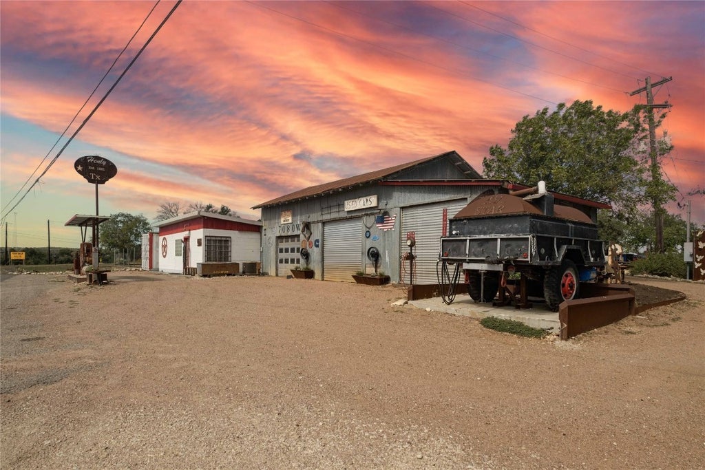 Built in the mid 40’s, this historic mainstay in the Hill Country has been a visual delight to passersby for the last 70+ years. Just east of Ranch Rd. 165 on W. Hwy 290, this unique property is a blank canvas for any business. With original design elements, exposed ceiling beams & concrete walls, the ideas are endless. Imagine repurposing this vintage filling station into a motorcycle shop, a car club, coffee shop, smoke shop, bar, office, catering hall, retail outpost, or private event space. Although nostalgic, the vintage pumps are no longer active & the underground fuel tanks were removed in the early 2000s; ideal for those looking to step outside the box. This location has approximately 150+ ft of prime frontage road on US W. 290, between the crossroads of Dripping springs & the Henly cutoff. Situated in a high-traffic area w/ excellent visibility, this property is a prime location for any business. Main structure has 2,000 sq ft w/ air-conditioned office, half bath, a 20’x14’ covered out bay, w/ 3 roll up gates sitting on .30 acres; back lot has 4 retrofitted containers perfect for an office/retail space: three 20’ containers - asking $1,250/mo each + one 30’ container - asking $1,750/mo; all complete with a mini-split, wood flooring, beautiful windows and hand sink, the larger container also has a private full bath and roof deck. All tenants have access to the powered stage, 5 supplemental restrooms + massive entertaining space. This eclectic landmark building features classic 1940s era architecture, one vintage gas pump, a working antique air compressor, remote controlled vintage fire truck, 2 retro 1950s (non-working) trucks, Americana nostalgia at its best. Equipped w/ a 3 phase power system, 30k gallon rainwater collection tank, working commercial well, septic system, well maintained HVAC system + mini splits. Just 10 minutes from downtown Dripping Springs, 18 minutes to Johnson City & Blanco, and a quick 45 minutes to Austin.
