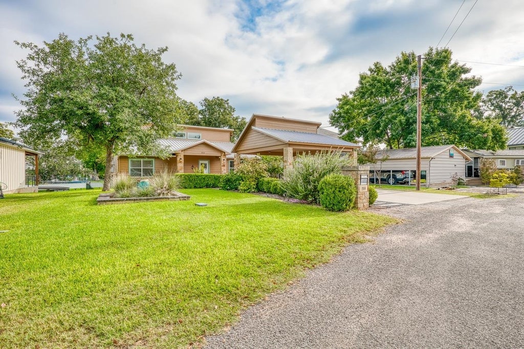 Location is PRIME! Quiet channel, beautiful huge trees outline this pristine lake house that was enlarged, remodeled, updated & absolutely such a perfect setting & totally done for the lucky buyer that discovers this little gem! This home sits literally one row off of the big open water but tucked away on a scenic channel that is a couple of minutes to the action on Lake LBJ, a golf cart ride away from BOAT TOWN, great restaurants & everything that comes along with lake life! If you want to choose the quiet, relaxing atmosphere of letting the family enjoy the weekends or more full time, look no further! This is also a great opportunity to invest for short- or longer-term rentals, AIRB&B ready! There are 3 bedrooms, each with private full bathrooms, a cute study, additional powder room, & the most updated kitchen that includes 3 sinks, BOSCH appliances, light & bright with tall ceilings, extra windows & great lighting. The home has bamboo flooring in the family room, beautiful tile as well as a very convenient outdoor grill/sink to enjoy the outdoor living. There is a tall metal covered porch, sitting areas & outdoor table. Outdoors, there is a boat dock with lift, 2 jet ski lifts, fire pit and grassy areas for pets or kids to play. The wrought iron fence encloses the entire backyard, going to the lake, with an additional storage building. The home is priced UNFURNISHED, however all major appliances will remain. Furnishings could be negotiated on a separate bill of sale. 2018 Flood, HOUSE DID NOT FLOOD!