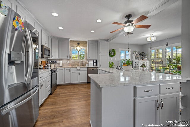 Lakeside Living with Room to Breathe. Imagine waking up to sparkling Lake McQueeney views from your back porch, with open grazing land stretching out behind you and very few neighbors in sight. This updated, move-in ready home offers the lake lifestyle without the crowd. Inside, you'll find a beautifully remodeled kitchen with quartz countertops, farm sink, stylish cabinetry, and a convection oven-perfect for entertaining or quiet mornings at home. Fresh vinyl plank floors flow throughout, leading to modernized bathrooms with a clean, updated look. Step outside to enjoy evenings by the fire pit, mornings on the extended front porch, or projects in your own separate hobby room (already set up with electrical and plumbing). A gated entry, 30-amp RV hookup, carport, and extra storage make this property as functional as it is charming. Additional perks: surround sound, UV HVAC lights, even heated and cooled dog houses. Plus, you're just down the road from Laguna Marina and directly across from Lake Breeze Ski Lodge-all while sitting safely outside the 100-year floodplain.