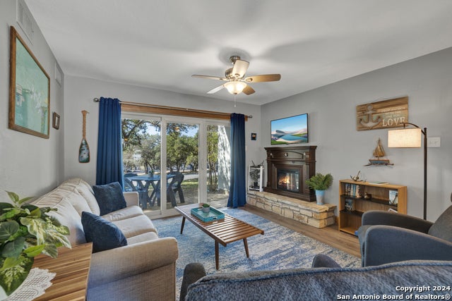 This Canyon Lake Condo is a fantastic retreat set on a beautiful oak-covered property, offering serene surroundings with amenities such as a swimming pool, picnic tables and barbeque pits. The two-bedroom, two bath split floor plan includes a cozy living room with a fireplace and TV, perfect for relaxing. This is a downstairs corner unit with no stairs. The owners retreat features a king-sized bed and a private en-suite bath for ultimate comfort and privacy. Great bedroom closet with styling barn door and large bath vanity for your personal belongings. The kitchen is bright and light with all updated white cabinets, appliances, backsplash and a farmhouse sink. Butcher block countertops add a nice touch and contrast along with a bar area. Newer windows and sliding glass doors lead to a double patio where you can enjoy the peaceful outdoors and wildlife. The condo has been refreshed with vinyl flooring, walk in shower, whitewashed accent walls and natural wood touch, creating a calming atmosphere. Fully furnished, this unit is currently being operated as an overnight rental, offering the opportunity for income when not in use. It's the perfect mix of relaxation and investment potential in a sought-after area. Forgot to mention updated A/C and water heater. Located close to grocery stores and restaurants. You will love this beauty!