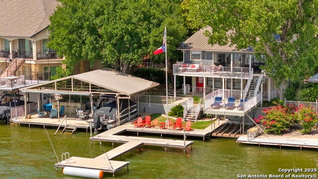 What's your Lake LBJ move-wake surfing by 9am, hosting 20 friends on your extended dock by sunset, or walking straight from your outdoor bar into the water without ever leaving your property? This is Lake LBJ living without the usual compromises. No seasonal water fluctuations. No climbing down sketchy ladders. No wondering if your dock will be usable come summer. Just consistent, year-round access to some of the best water in the Highland Lakes-with an outdoor setup that turns every weekend into an event. The dock is where you'll live: This isn't a basic two-chair setup. Your extended dock comfortably seats 20+ guests across multiple zones-gathering around the fire pit, bellying up to the full bar, or sitting down for an actual meal at the spacious dining table. The outdoor kitchen is fully loaded: built-in grill, sink, refrigerator, and storage, all strategically lit for those long summer nights that turn into early mornings. And here's the move that changes everything: when the Texas heat kicks in, you don't trek back to the house. You simply step off the bar platform directly into the lake, grab your lily pad, and you're floating-cocktail optional but recommended. Inside, the split-level design just works: The main level handles the practical side of lake life-family gathering space, full bathroom, guest bedroom, and laundry facilities positioned where they make sense. No hauling wet towels and lake gear up multiple flights. Head upstairs and the view takes over. Open-concept living with wall-to-wall windows and sliding glass doors that frame panoramic lake vistas. The kitchen flows seamlessly into dining-designed for the kind of casual entertaining that defines lake culture. Two additional bedrooms and a full bath complete the upper level, with every room oriented to capture those water views. The covered patios deserve their own mention: Expansive outdoor living space on multiple levels. The upstairs patio features retractable electric shades-because sometimes you want the morning sun with your coffee, and sometimes you want shade with your afternoon beverage. These are the spaces where you'll realize indoor square footage matters less when your outdoor living is this dialed in. Location puts you in the center of it all: Quick boat ride to the legendary LBJ sandbar where the lake community gathers. Wake Point is minutes away for waterfront dining and fuel. You're positioned in the sweet spot-peaceful enough for morning tranquility, close enough to the action when you want it. This property isn't about checking the "lakefront" box on your search criteria. This is about waking up every Saturday feeling like you're already on vacation, hosting the gatherings your friends talk about all week, and finally understanding why people become obsessed with Lake LBJ.