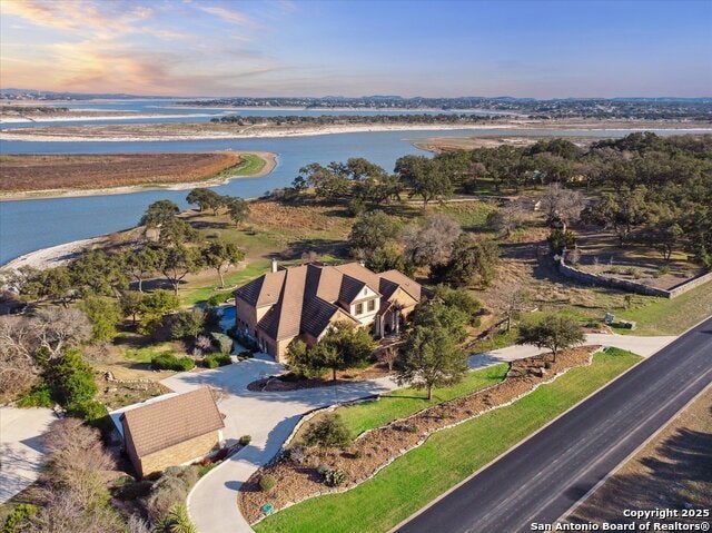 Located in the prestigious gated community of The Peninsula at Mystic Shores, this breathtaking 5-bedroom, 5.5-bathroom estate offers the perfect blend of luxurious living and serene lakeside beauty. Set on a sprawling 2.4-acre lot with 414 feet of private waterfront on Canyon Lake, this exceptional property boasts 5,571 square feet of living space and showcases stunning water views from nearly every room. The home's exterior is a perfect harmony of brick and stone, complementing the natural landscape and