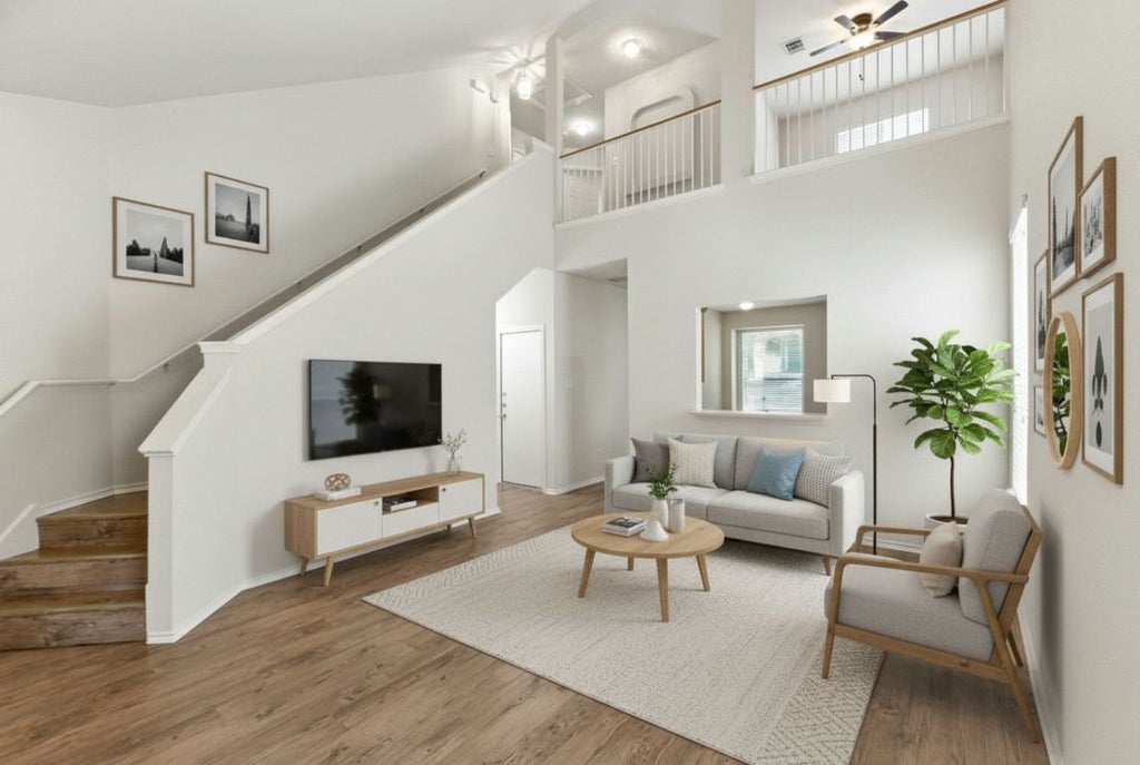 Tucked into the heart of Forest Oaks, 1114 Peyton Place offers a comfortable layout, flexible living spaces, and a location that makes everyday life easy. This 3-bedroom, 2.5-bath home spans 1,632 square feet and is designed for function and flow. Step inside to a bright living room with vaulted ceilings that create a spacious feel. The open kitchen and dining area give you room to spread out, host friends, or keep it simple on quiet nights. The main-level primary suite includes a walk-in closet, a roomy garden tub, and a separate walk-in shower. Upstairs, two bedrooms are located on one side of the home with a full bath nearby, while a separate loft sits on the other side — ideal for a second living room, home office, or play area. A half bath is conveniently located downstairs for guests, and the main-level laundry room adds everyday ease. One of the best parts of this home is the fully screened back porch, offering a peaceful, private place to relax. A front porch adds curb appeal, and the backyard is just the right size, easy to care for, with space to enjoy. Forest Oaks is a well-established community with two pools, playgrounds, trails, and a clubhouse. With top-rated Leander ISD schools and quick access to 183A, Costco, Whole Foods, Target, and Brushy Creek Trail, the location checks all the boxes for convenience and quality of life. If you're looking for a home that’s practical, comfortable, and well-located, this one is ready to welcome you home! Some photos include virtual staging to help visualize furniture placement and use of space.