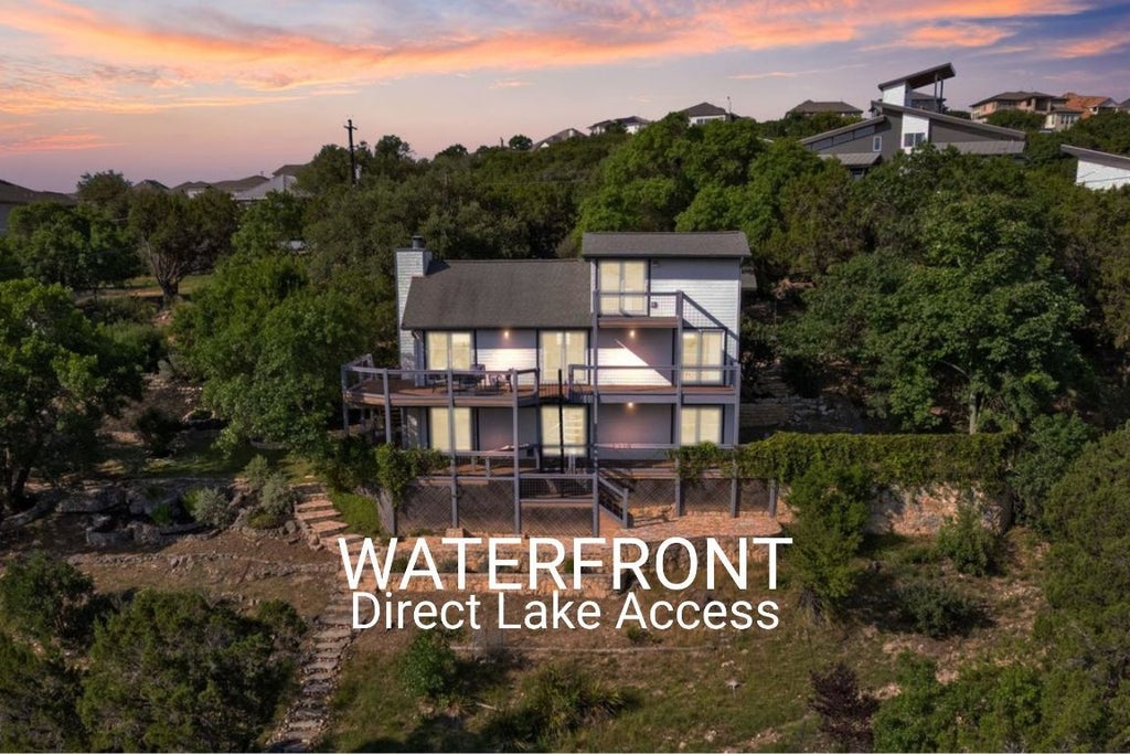 This waterfront home welcomes you on the main (second) level with vaulted ceilings, a painted stone fireplace, hardwoods, Pella sliding doors, and walls of windows framing the lake and hill country. Thoughtfully remodeled—twice—this 1984 charmer has updated kitchen, baths, flooring, Hardie siding, paint (interior & exterior), and more.