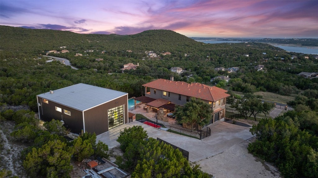 Welcome to "Casa en la Colina"! Perched high on a hillside with sweeping 180-degree views of Lake Travis, this extraordinary Mediterranean-inspired estate delivers the ultimate Hill Country lifestyle. Set on 1.6 acres, with mature trees lining both sides of the lot for privacy, the property offers a rare combination of seclusion, amenities, & jaw-dropping scenery & Over $500k put into renovations and upgrades over the past 2 years! Lake views can be enjoyed from nearly every angle—whether relaxing on the front terrace or taking in the sunset from the side patios. Inside, the inviting & one-of-a-kind interior features recent windows, custom finishes, stone & wood flooring, & timeless charm. The accordion glass doors create an ideal flow for indoor-outdoor living. The gourmet kitchen, breakfast room, & patios all showcase panoramic lake & Hill Country views. The flexible floor plan offers 4 bedrooms & 4.5 bathrooms, including a guest suite on the lower level. Upstairs, the luxurious primary suite enjoys sweeping lake views, an oversized covered deck, an elegant bath, & 2 spacious walk-in closets—perfectly suited for a true retreat. The upstairs also features a secondary living area currently used as a home theater, offering an ideal space for movie nights or casual gatherings. Outdoors, the amenities are truly unmatched: a resort-style pool with water features, beach entry, & negative edge overlooking the lake, an oversized hot tub, a half basketball court, turfed & landscaped lawn space, & 2 fireplaces (a gas fireplace by the hot tub & a wood-burning fireplace next to the outdoor kitchen). Car enthusiasts & hobbyists will love the massive 2,400 sq ft shop with AC units, car lifts, a loft, plumbing for 2 bathrooms, & an oversized garage door—providing endless potential for storage, workspace, or creative use. Unbeatable location in the charming village of Volente—just 30 minutes to downtown Austin, within highly rated Leander ISD, & minutes to Sandy Creek Yacht Club.