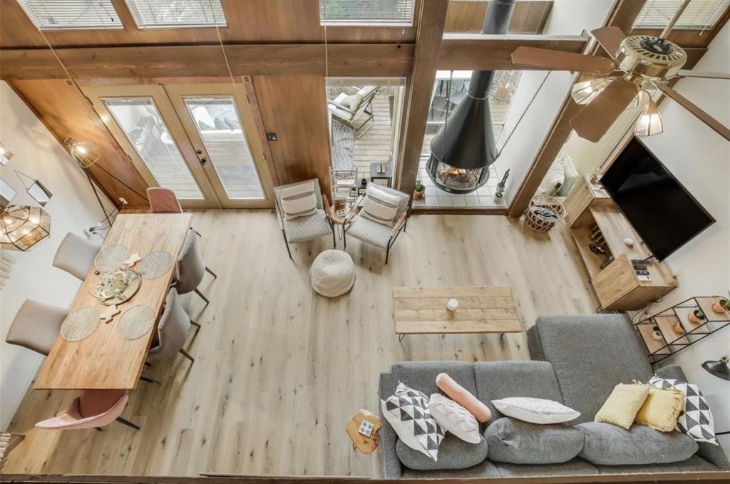 Views Views Views!!! This beautifully designed 3-story townhome frames sweeping Lake Travis views from two outdoor living spaces—an upper balcony for sunrise coffee and an expansive rear deck for sunset gatherings. Inside, an open kitchen/living/dining area is anchored by original woodwork, soaring ceilings, and a dramatic suspended wood-burning fireplace. The flexible 3-bed/3-bath layout includes a loft bedroom with its own bath—great for guests, an office, or a bunk room. Updates add ease and style: newer appliances, quartz countertops, and new flooring throughout. The rear deck features low-maintenance composite boards, and the supports beneath have been reinforced for peace of mind. Two mature oaks grace the front—perfect spot for a hammock in the shade. Enjoy the Point Venture lifestyle within minutes: tennis, pickleball, 9-hole golf, disc golf, community pool, library, gym, and a 56-acre private beach park with boat launch, floating restaurant, and marina. Smart-home touches convey, including Hue lighting switches/bulbs plus Ring doorbell and alarm. All furnishings and appliances convey, making this an easy turnkey lake retreat, full-time home, or investment opportunity.